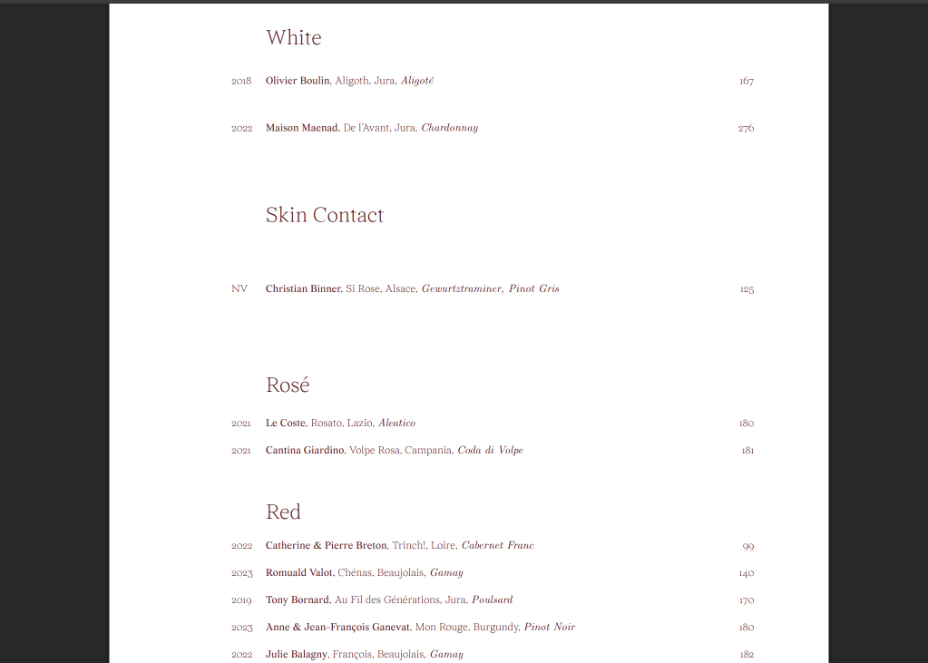 Choux Restaurant in Amsterdam is another favourite. Despite their newly minted Michelin star, prices remain fair. But that a venue like this, which specialises in natural, does not give its countless oranges star billing just feels off. This is an excerpt from their ‘white wine’ section:
