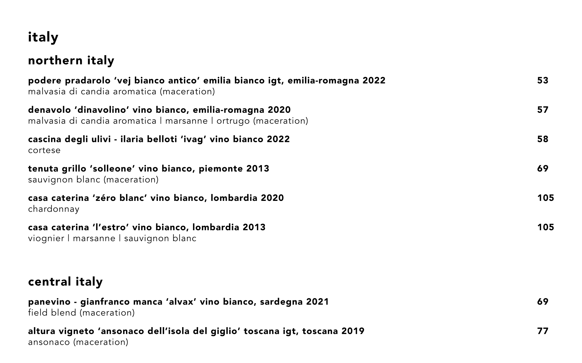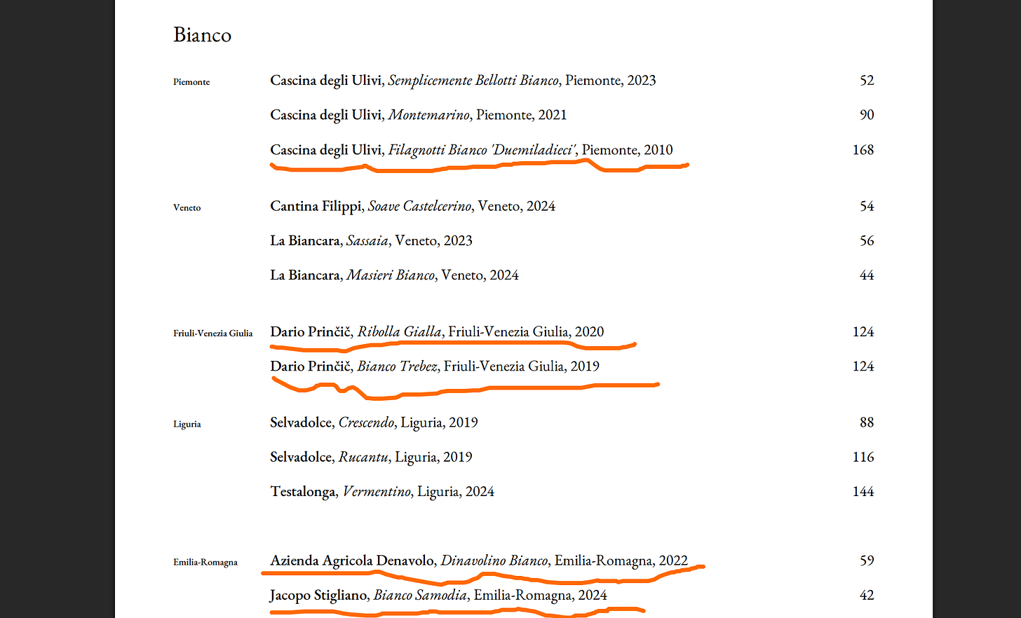 Osteria Vibrato (Soho, London), who I wrote about last week, mix a number of fine oranges amidst their whites, leaving either the unwary customer or the waiting staff to disentangle the two. They don’t wield the dreaded SC term, but this is hardly a better solution.