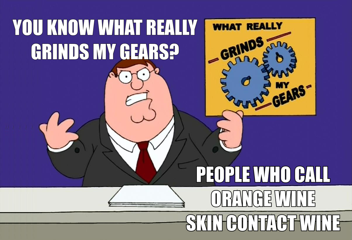It’s neither precise nor accurate. For the pedants, orange wine is skin fermented white wine. Skin contact often describes a pre-fermentation cold soak (aka the French macération pelliculaire). This technique does not impart the same aromas, flavours and tannins as skin fermenting.